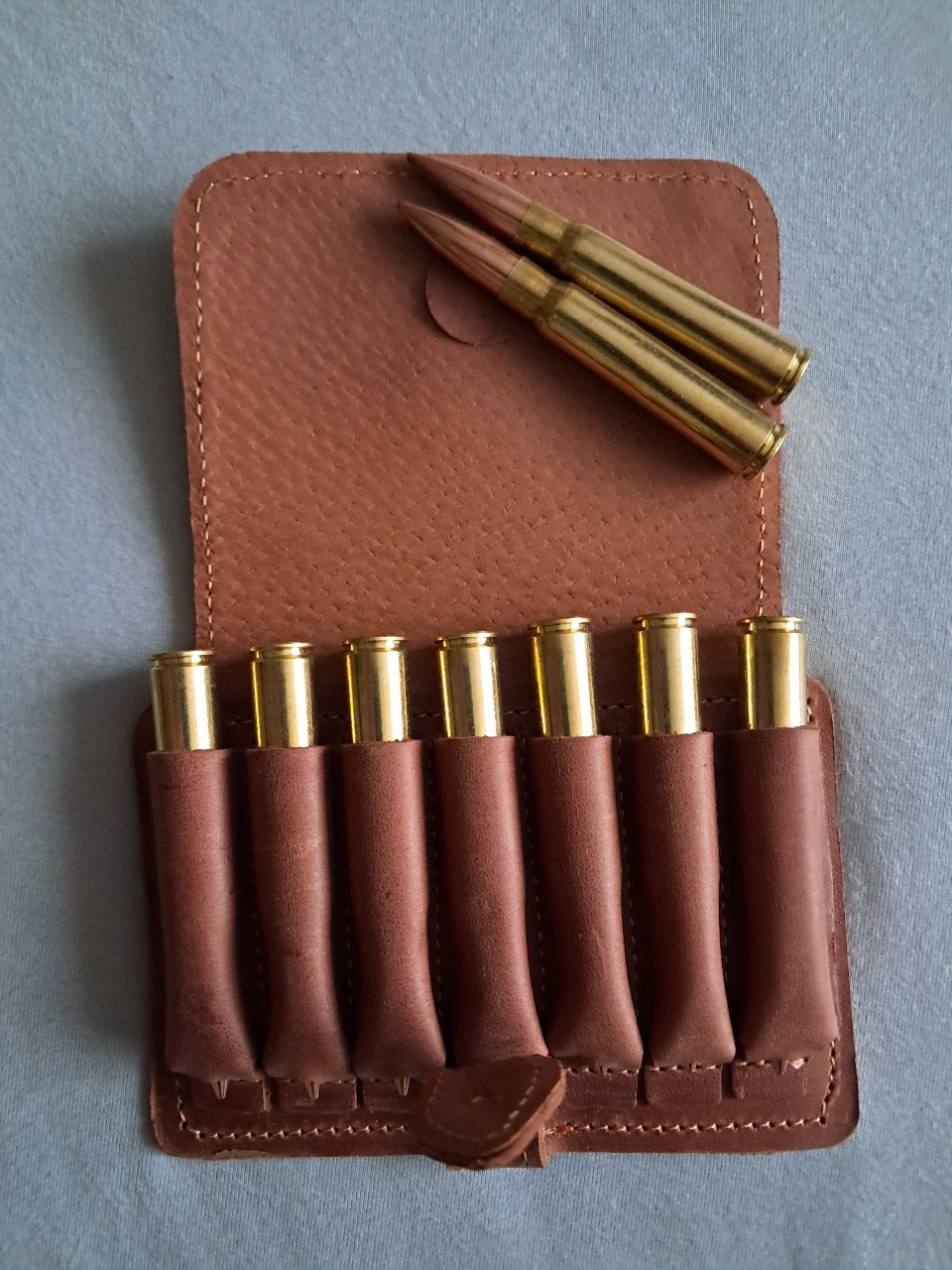 Kožené pouzdro na 7 kulových nábojů hnědé - představuje praktické a bezpečné řešení pro každého střelce. Tento výrobek kombinuje odolnou konstrukci, kompaktní tvar a funkční design. Díky přesnému provedení uchová náboje chráněné před vlhkostí, prachem i mechanickým poškozením. materiál: hovězina rozměry: 13,5 x 10 cm uzavřené pouzdro na 7 kulových nábojů ze zadní strany úchyt na opasek barva: světlá nebo tmavá hnědá na fotce náboje 8x57